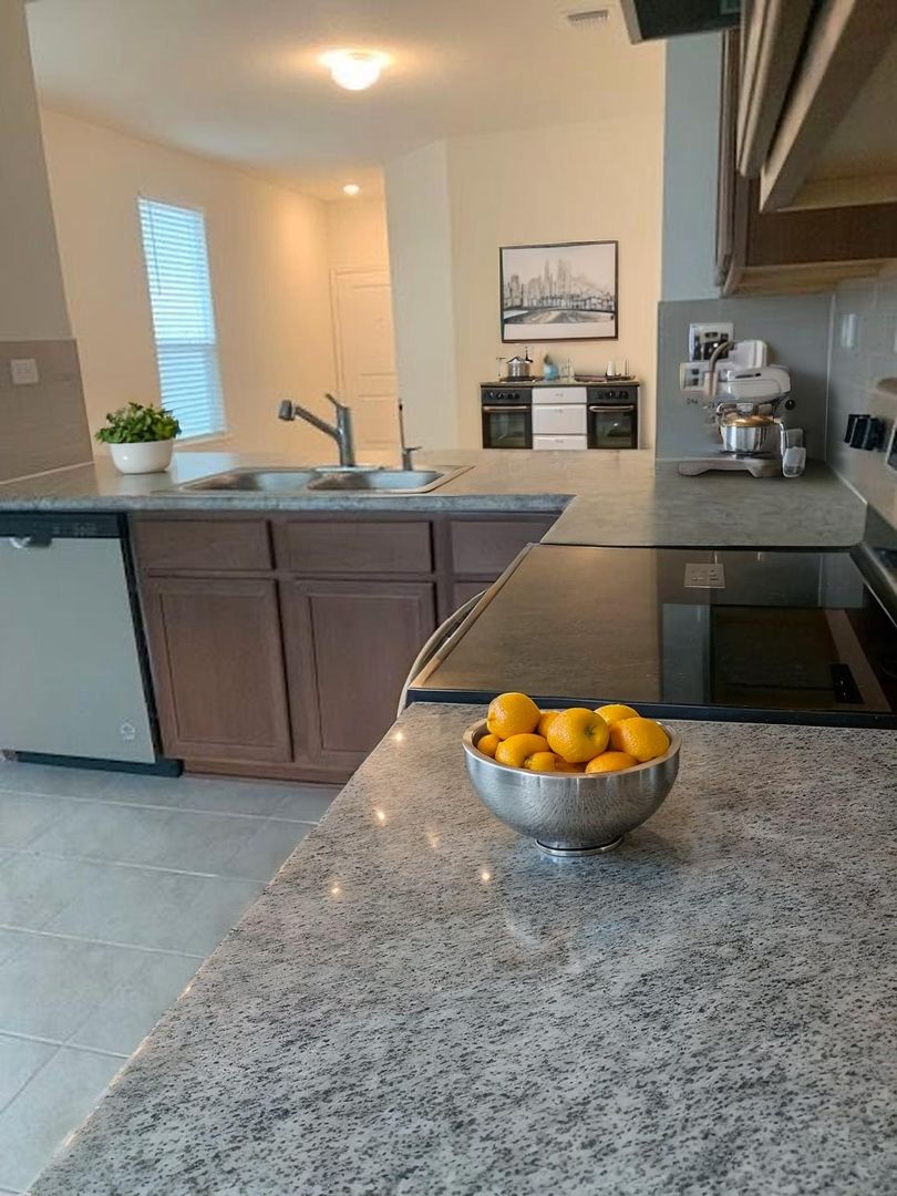 One story, 3 bedroom, 2 bath, 2 car garage. Built in 2023. Stainless steel appliances including refrigerator and an open concept floor plan with kitchen flowing to the dining room and living room. 9' ceilings makes the home feel very spacious! No carpet. Sprinklers system. Community pool and playground. Easy access to Highway 90 and 1604